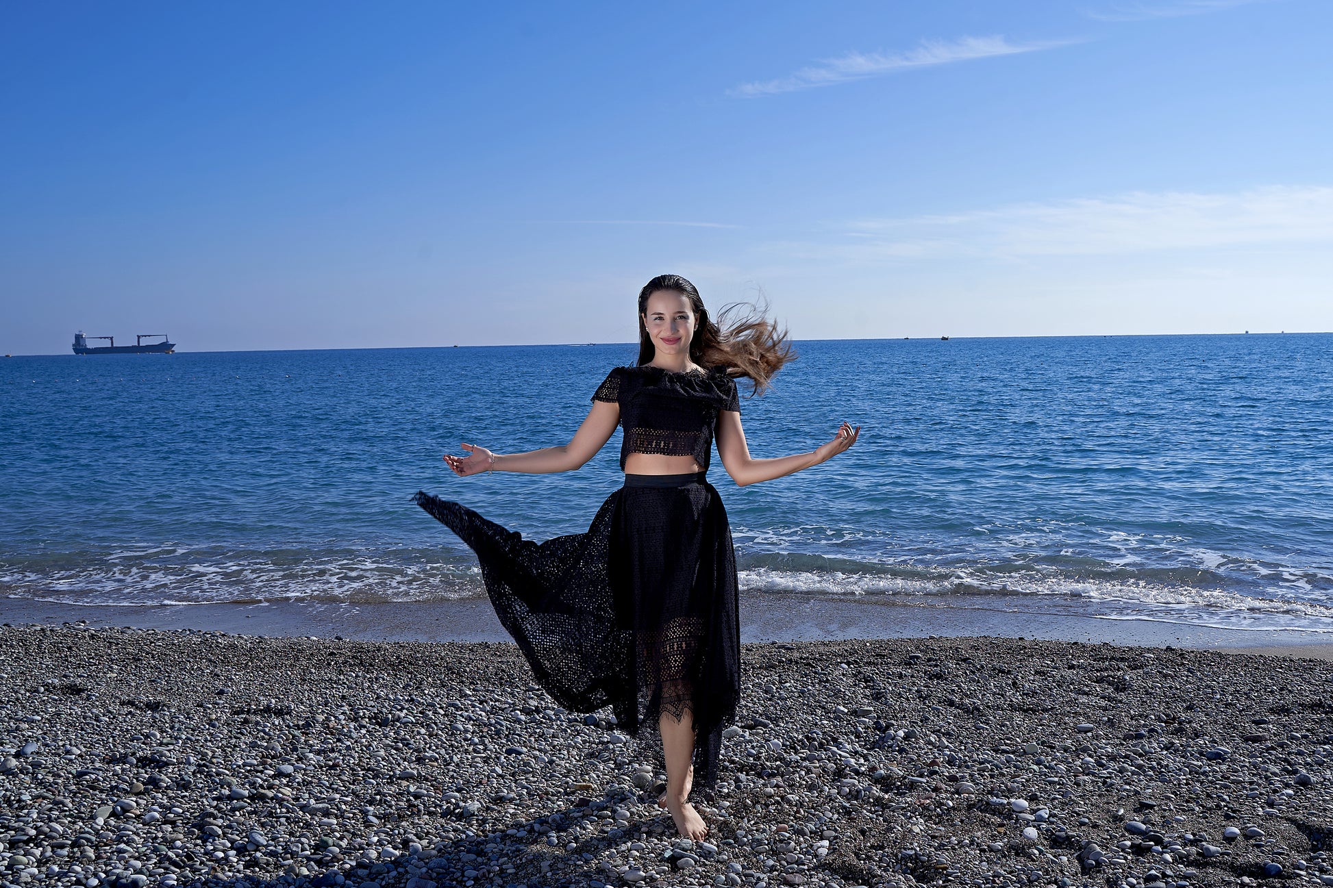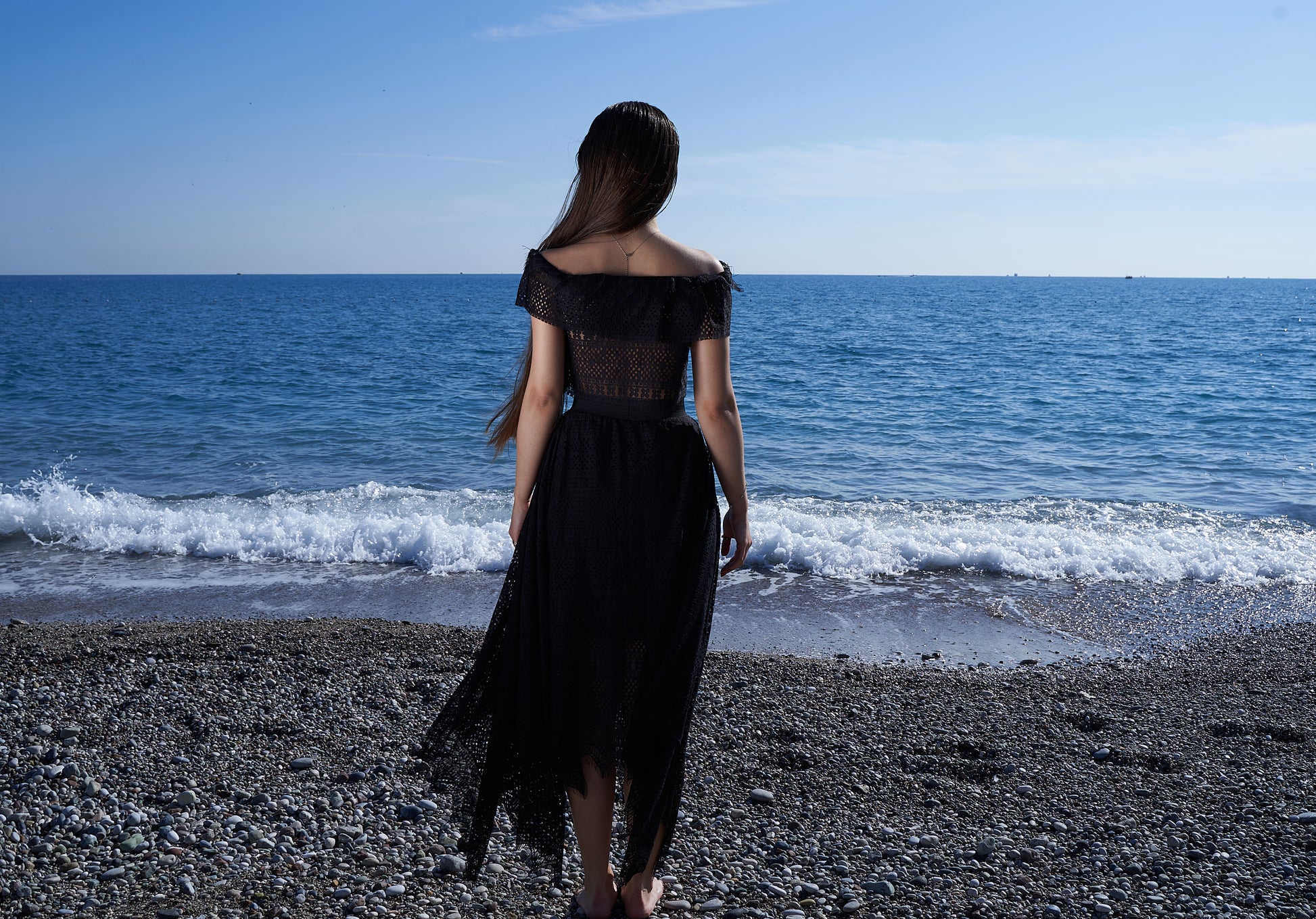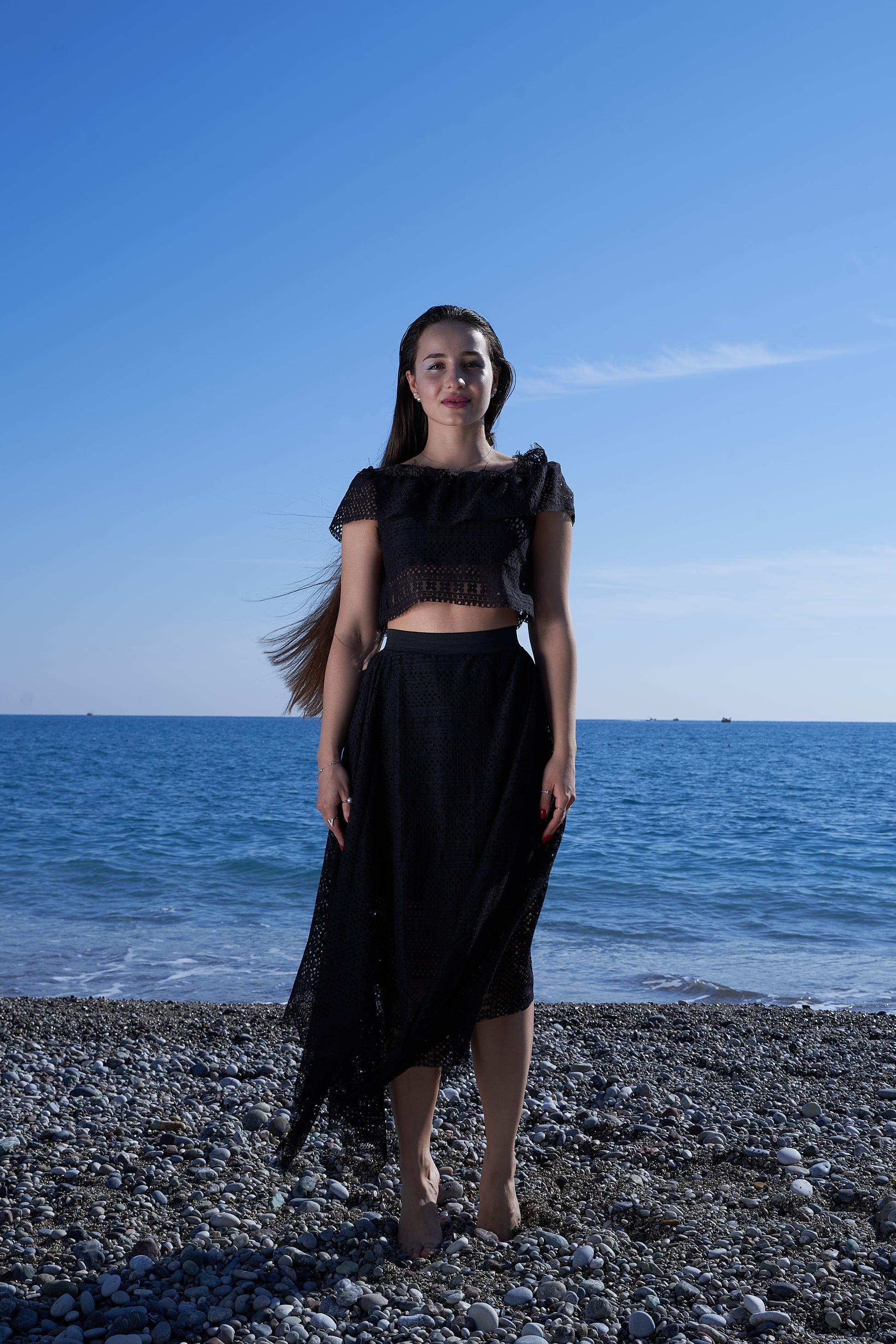 Coton noir avec une élégante texture de dentelle géométrique - un choix parfait pour l'été ! Haut à bande élastique pouvant être porté sur les épaules, jupe à bande élastique sans fermeture éclair et angles élégants sur les côtés