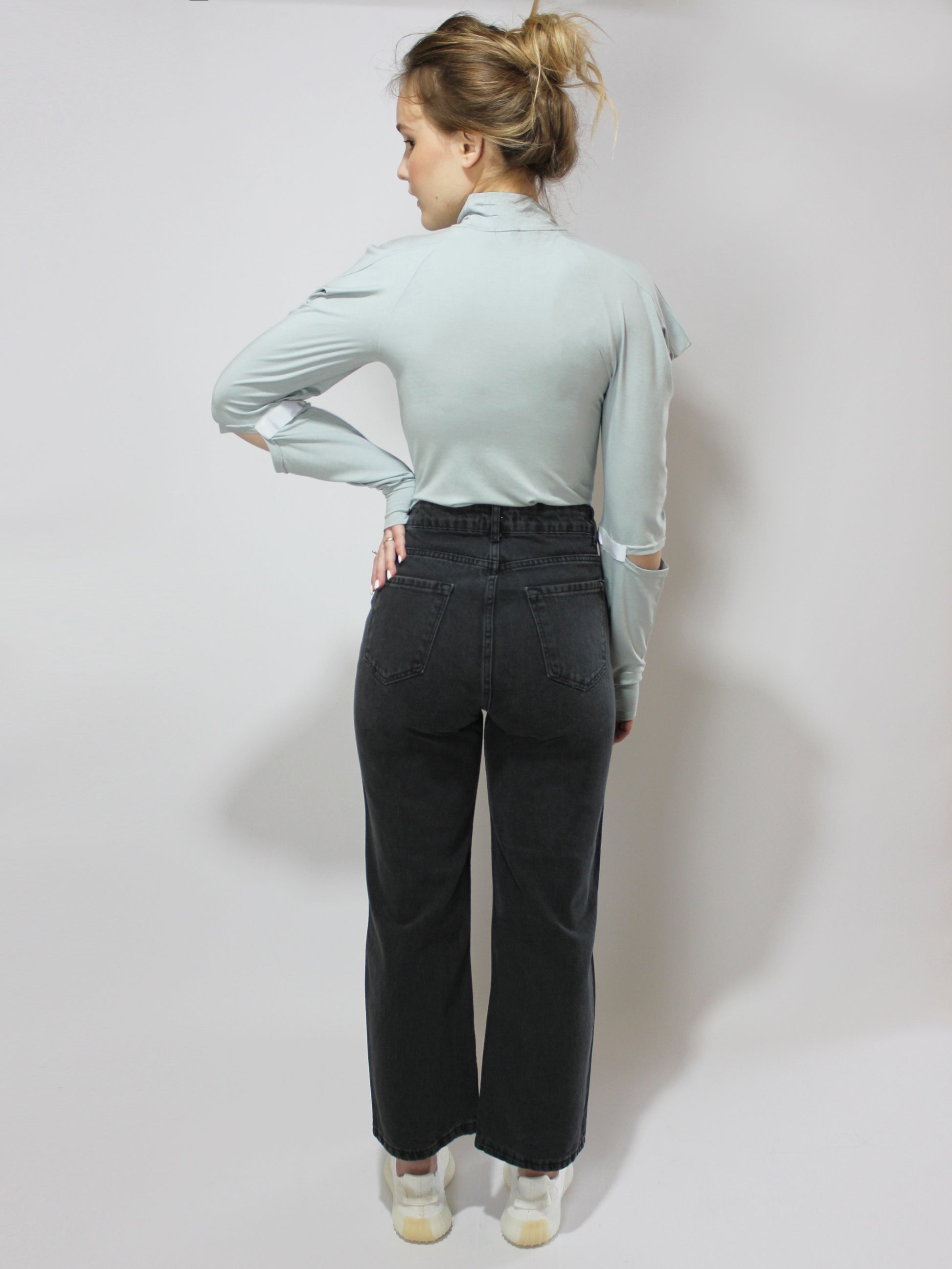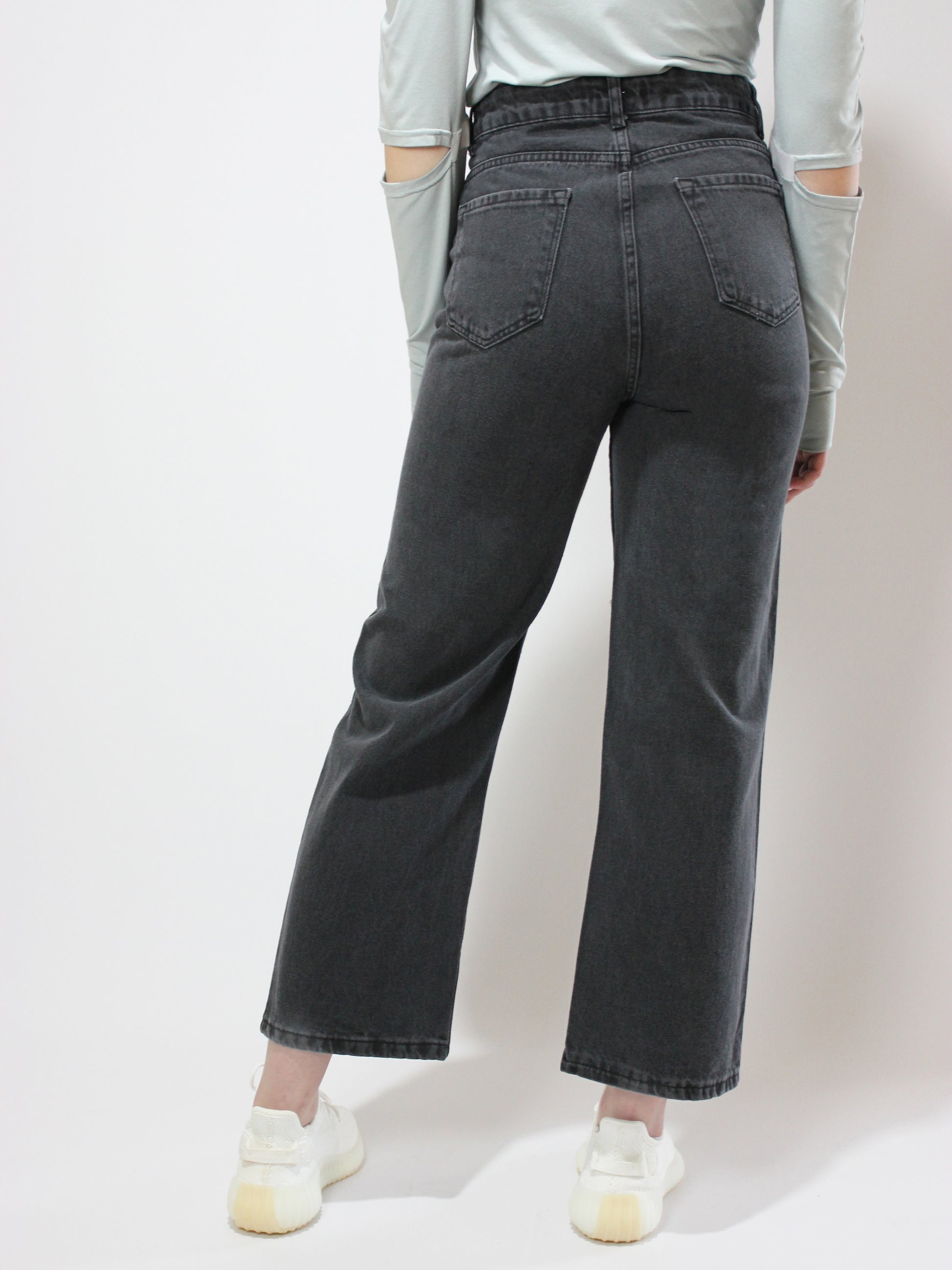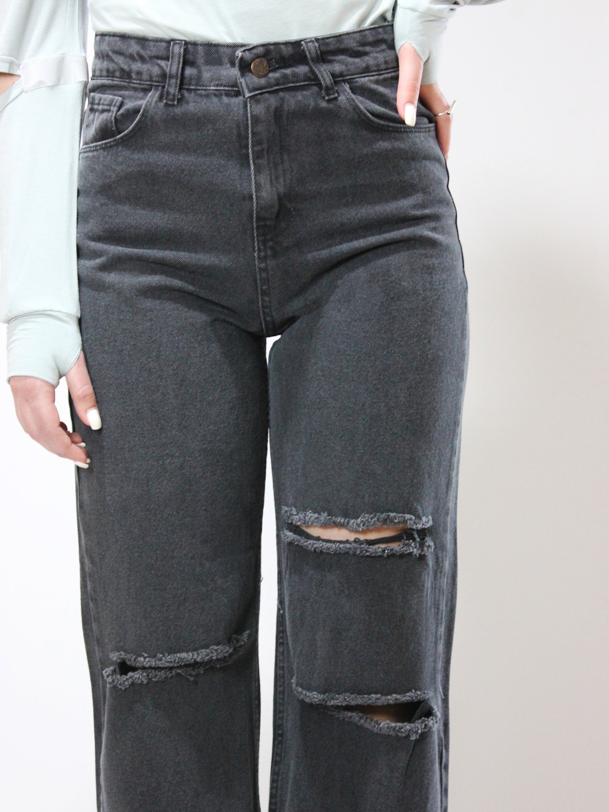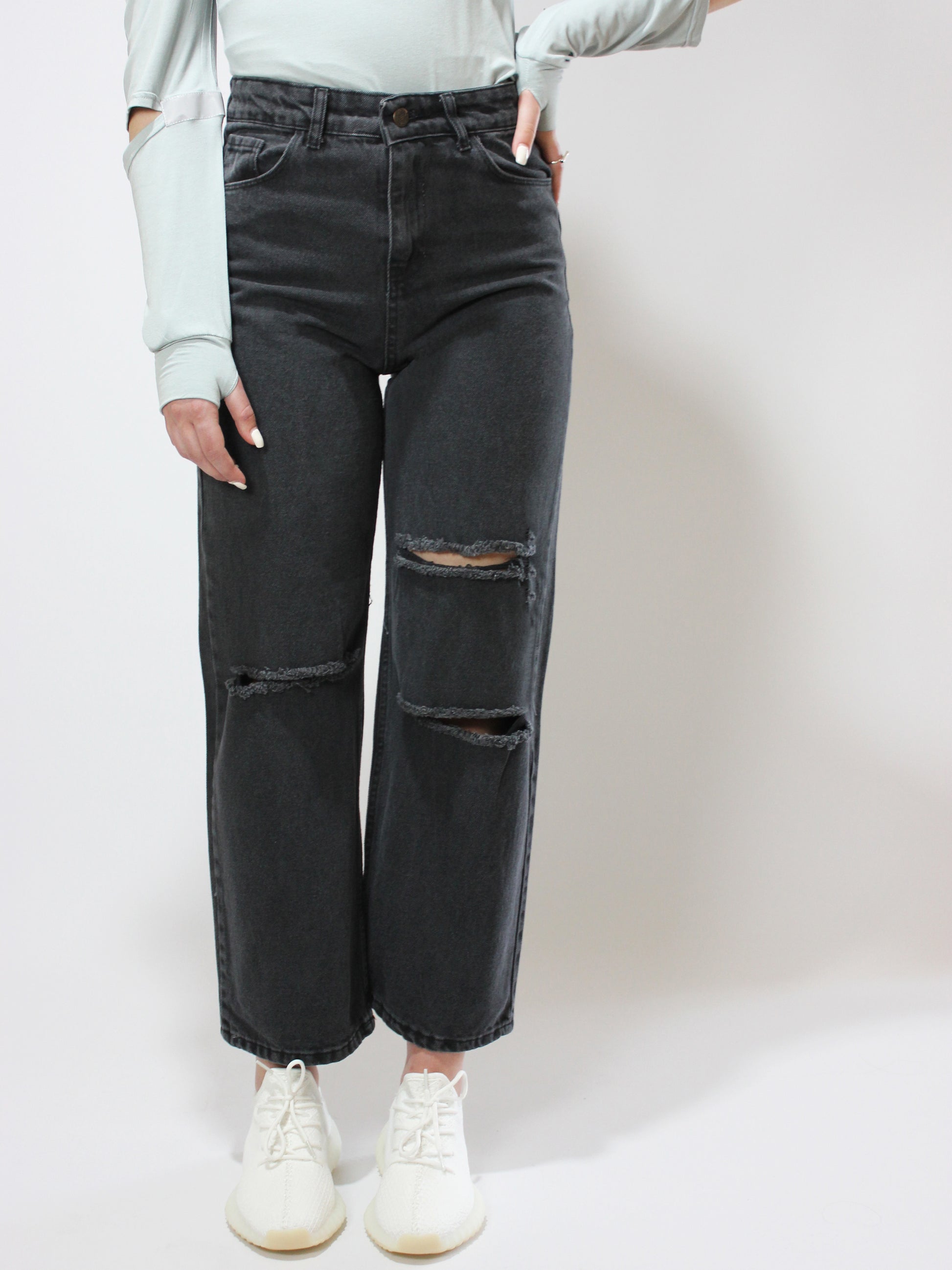 Широкие джинсы прямого кроя из натурального хлопка. Длина до щиколотки с рваными линиями на коленях.